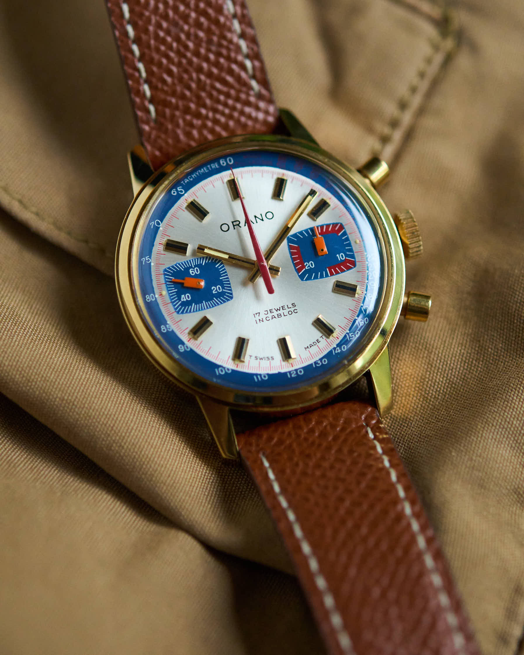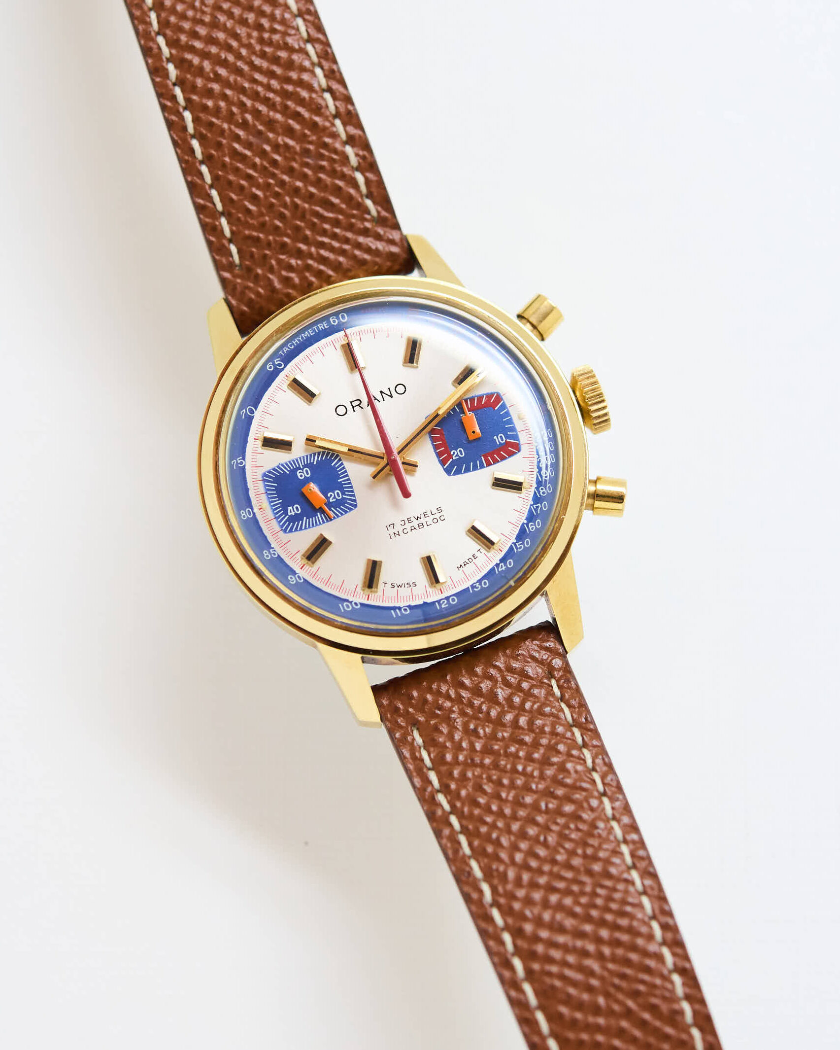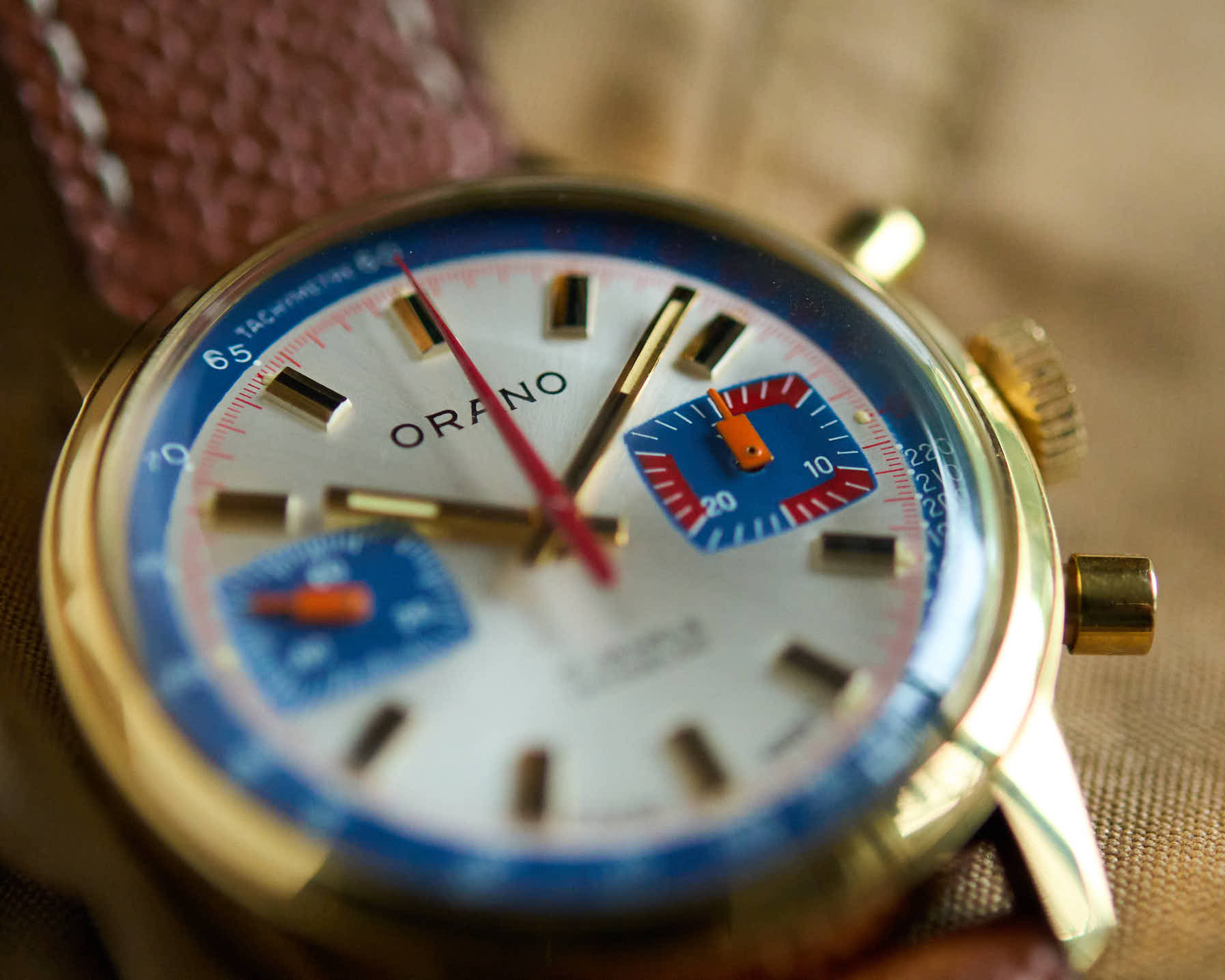 Le cadran de ce chronographe Orano frappe par son originalité visuelle : un fond clair — élégant et lumineux — rehaussé de compteurs contrastés et de touches bleu vif et rouge vif qui attirent immédiatement le regard.