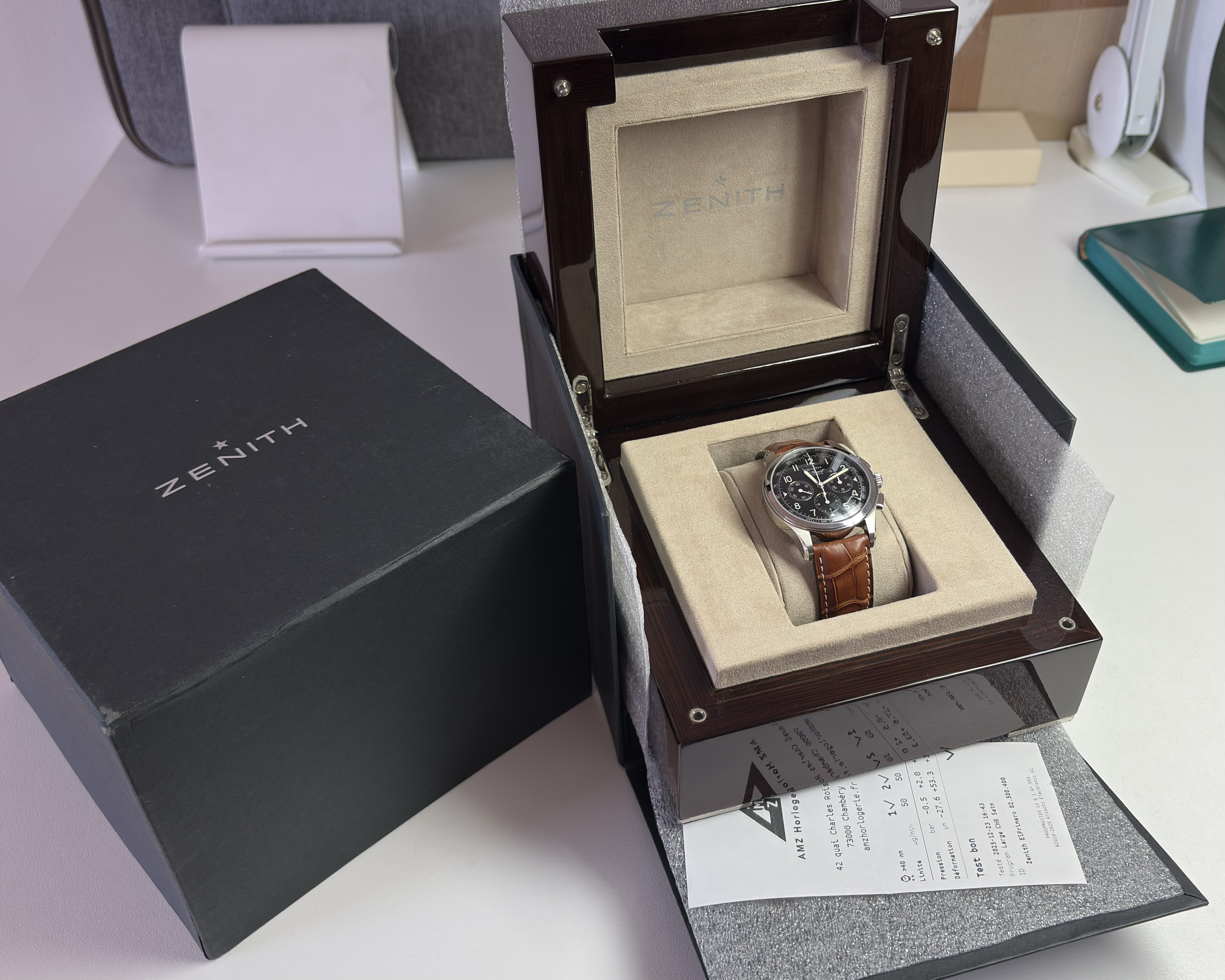 Cette Zenith El Primero référence 02.0500.400 illustre une facette plus fonctionnelle et instrumentale de la maison du Locle, où la haute horlogerie se met au service de la lisibilité et de l’usage. Produite autour des années 2000, cette version s’inscrit clairement dans une esthétique d’inspiration field et militaire, pensée avant tout comme un véritable outil de mesure du temps, sans pour autant renoncer à l’élégance propre à Zenith.